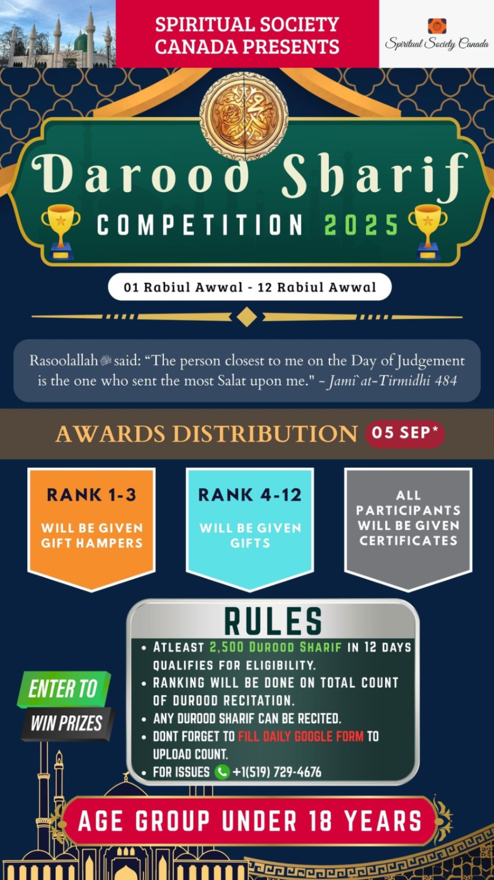 Correction: 🕌 SSCI Durood Sharif Competition 2025 – Disregard Previous Notification 🕌 Spiritual Society Canada is back with the Durood Sharif Competition starting 👉 TODAY AFTER MAGHRIB 👉 AGE GROUP UNDER 18 YEARS 👉 Any Durood Sharif can be recited 👉 At least 2,500 Durood Sharif in 12 days qualifies for eligibility 👉 All participants will be given certificates 👉 Ranking will be based on total count of Durood recitation 👉 Ensure daily count is submitted via Google Form 🔴 Fill the daily Google Form between 7 PM – 10 PM to submit each child’s Durood Sharif count 🔴 👉🏻 https://forms.gle/qhWqYef7CdE4ZdHD7 🏆 Awards Distribution – 05 September • Rank 1-3: Gift Hampers • Rank 4-12: Gifts • All Participants: Certificates Jazakallah -Management SSCI